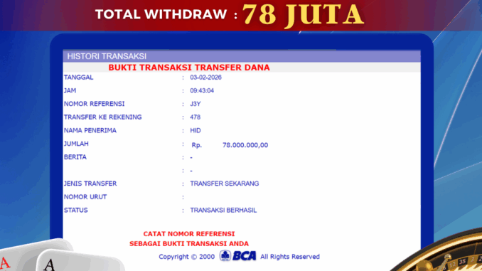 Bukti transfer yang dapat anda lihat adalah bukti SAH / VALID yang langsung di dapatkan melalui bukti transaksi dari Bank yang digunakan untuk pengiriman dana pada rekening pemilik user id. Terima kasih kami sampaikan kepada para pengguna setia BOLAGILA yang telah menggunakan situs kami, sebagai Bandar Terpercaya yang pastinya membayar semua kemenangan member hingga lunas. Apakah BOLAGILA PENIPU ? Reputasi “BOLAGILA TERPERCAYA” sudah sangat melekat.