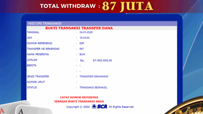 Bukti transfer yang dapat anda lihat adalah bukti SAH / VALID yang langsung di dapatkan melalui bukti transaksi dari Bank yang digunakan untuk pengiriman dana pada rekening pemilik user id. Terima kasih kami sampaikan kepada para pengguna setia BOLAGILA yang telah menggunakan situs kami, sebagai Bandar Terpercaya yang pastinya membayar semua kemenangan member hingga lunas. Apakah BOLAGILA PENIPU ? Reputasi “BOLAGILA TERPERCAYA” sudah sangat melekat.