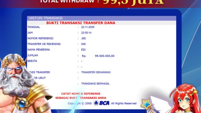 BOLAGILA mengucapkan selamat kepada user id : EDI*** yang telah berhasil mendapatkan jackpot pada permainan SLOT DI LEGEND OF PERSEUS. Kemenangan sebesar Rp 99.500.000,-. telah dibayarkan LUNAS oleh pihak bolagila kepada pemilik user id setelah yang bersangkutan mengisi formulir withdraw. Proses pencairan dana berlangsung sangat cepat hanya dalam waktu 6-11 menit Sudah berada dalam rekening pemilik user id.
