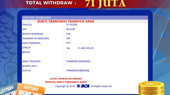 MEMBER BOLAGILA MENERIMA PELUNASAN KEMENANGAN JACKPOT TOGEL DI JAKARTA 4D Rp 71.000.000,- LUNAS